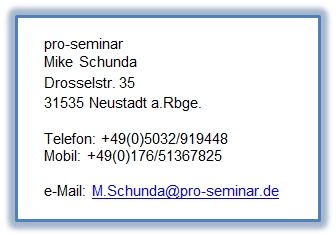 Wenn Sie an weiteren Informationen interessiert sind oder Fragen haben, dann setzen Sie sich doch ganz einfach per Brief, Telefon oder e-Mail mit mir in Verbindung.